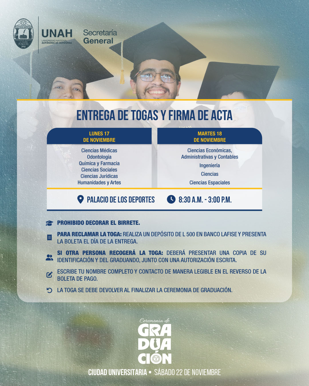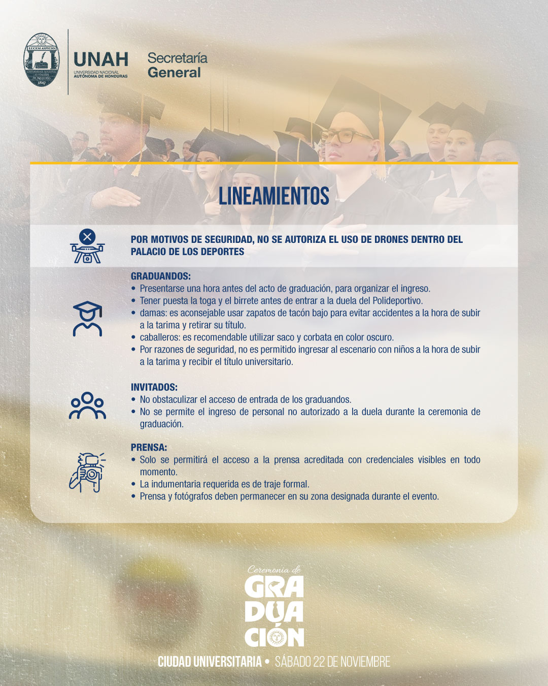 La Secretaría General es el órgano de comunicación oficial, interna y externa de la UNAH, su titular es el Secretario General, cuyo nombramiento corresponde a la Junta de Dirección Universitaria. Son responsabilidades del Secretario General: registrar, certificar y notificar los actos resolutivos y demás diligencias administrativas de la UNAH. Las funciones de la Secretaría General son las siguientes: